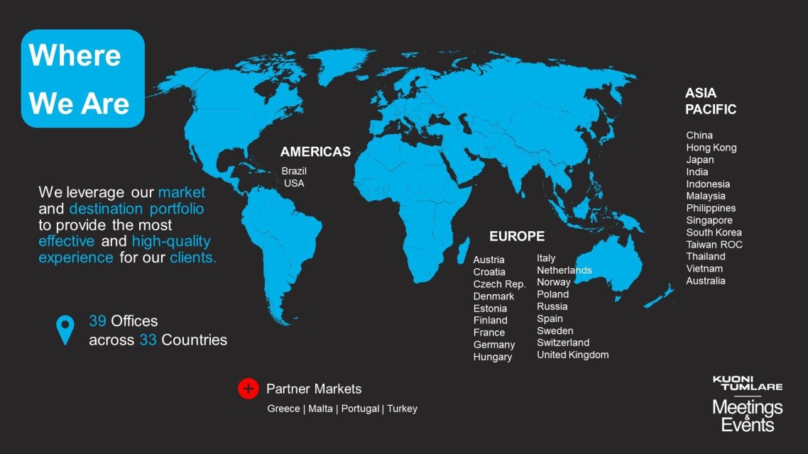 Our 1,200+ experts are located in 39 offices, across 33 countries globally. Our wholly owned service delivers continuity in service that is tailored to meet your needs, whether it be end to end project management or just some support for individual parts of your event we are happy to help.
