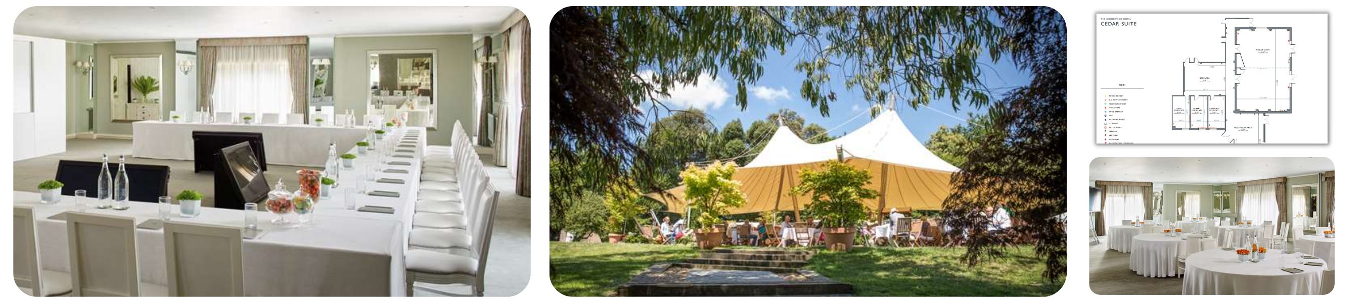 The Cedar Suite - The largest event space at Goodwood Hotel, also has its own entrance and a host of additional facilities. With large mirrors and floor to ceiling windows this is a beautiful, light and airy, modern room. A perfect space for gala dinners, product launches, exhibitions, meetings, weddings and much more. There is direct access to an outdoor event space, The Cedar Lawn Canopy, which is situated in a secluded garden and perfect for events, from a simple champagne reception, to an informal barbecue or a typically-British garden party. (Available during the warmer months of April to October)