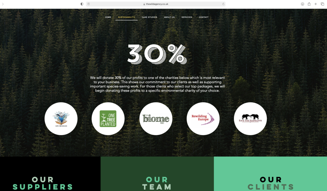 The Wild Agency is a Marketing & PR Company with an environmental and sustainable ethos. Our USP is that we are zoologist, conservationist and ecologist-led. We donate 30% of our profits to causes which are important to our clients, creating better stories on their behalf, whilst funding important species-saving work.