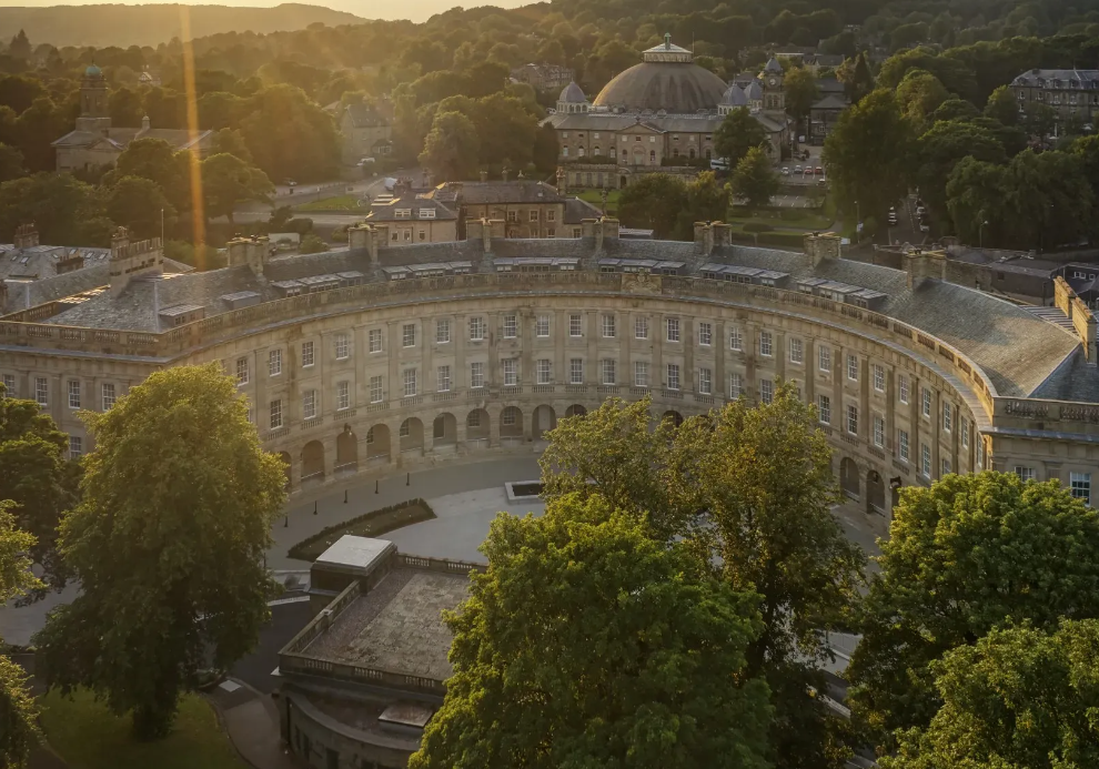 Buxton Crescent stands on the edge of the Peak District national park, accented by a never ending treeline behind this incredibly renovated structure.
