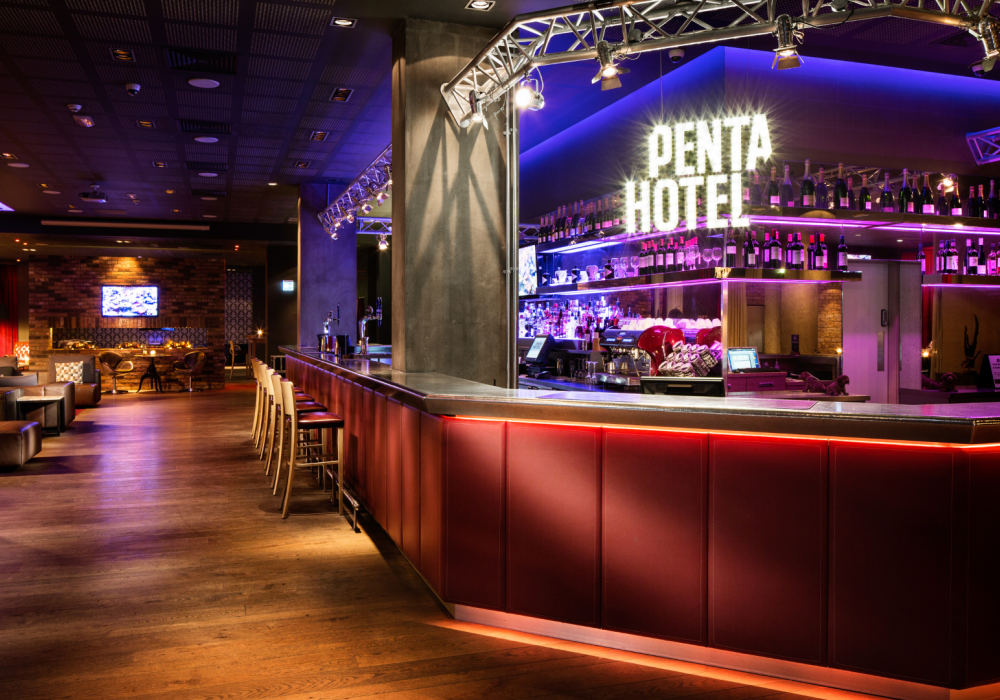 Once inside Pentahotel Reading, the first thing that strikes you is just how funky and playful everything is – from the disco ball as you enter the front door to the dart boards, Penta Hotel illuminated logos and dramatic curtains - it instantly puts a smile on your face.